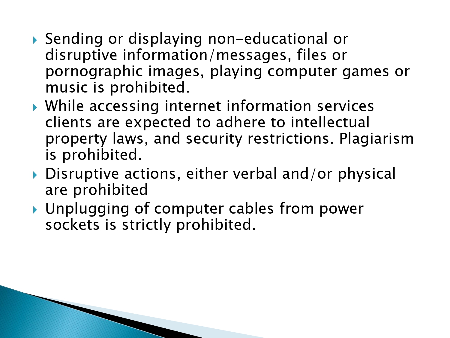 - While accessing internet information services clients are expected to adhere to intellectual property laws, and security restrictions. Plagiarism is prohibited.