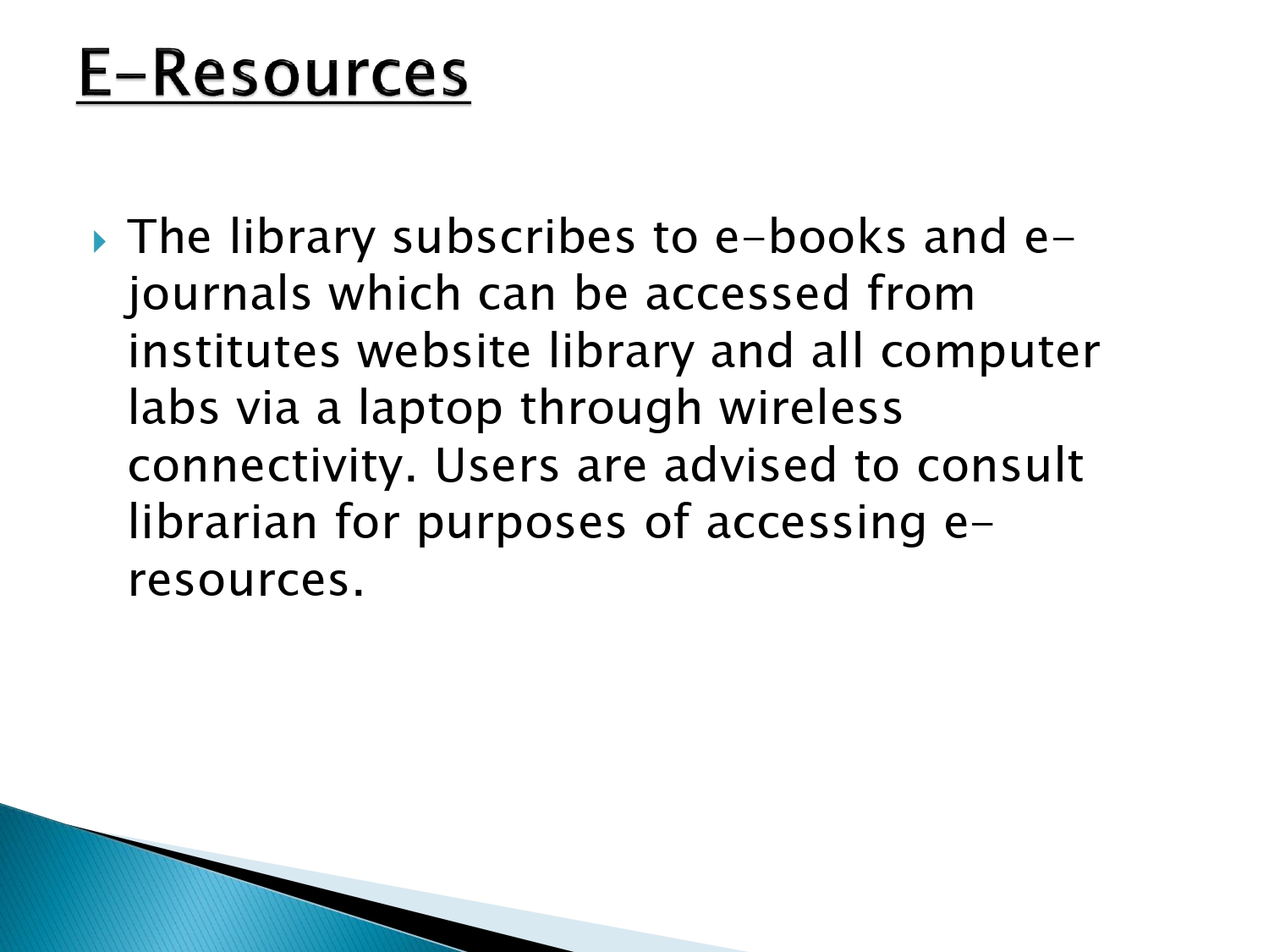 The library subscribes to e-books and e- journals which can be accessed from institutes website library and all computer labs via a laptop through wireless connectivity. Users are advised to consult librarian for purposes of accessing e- resources.
