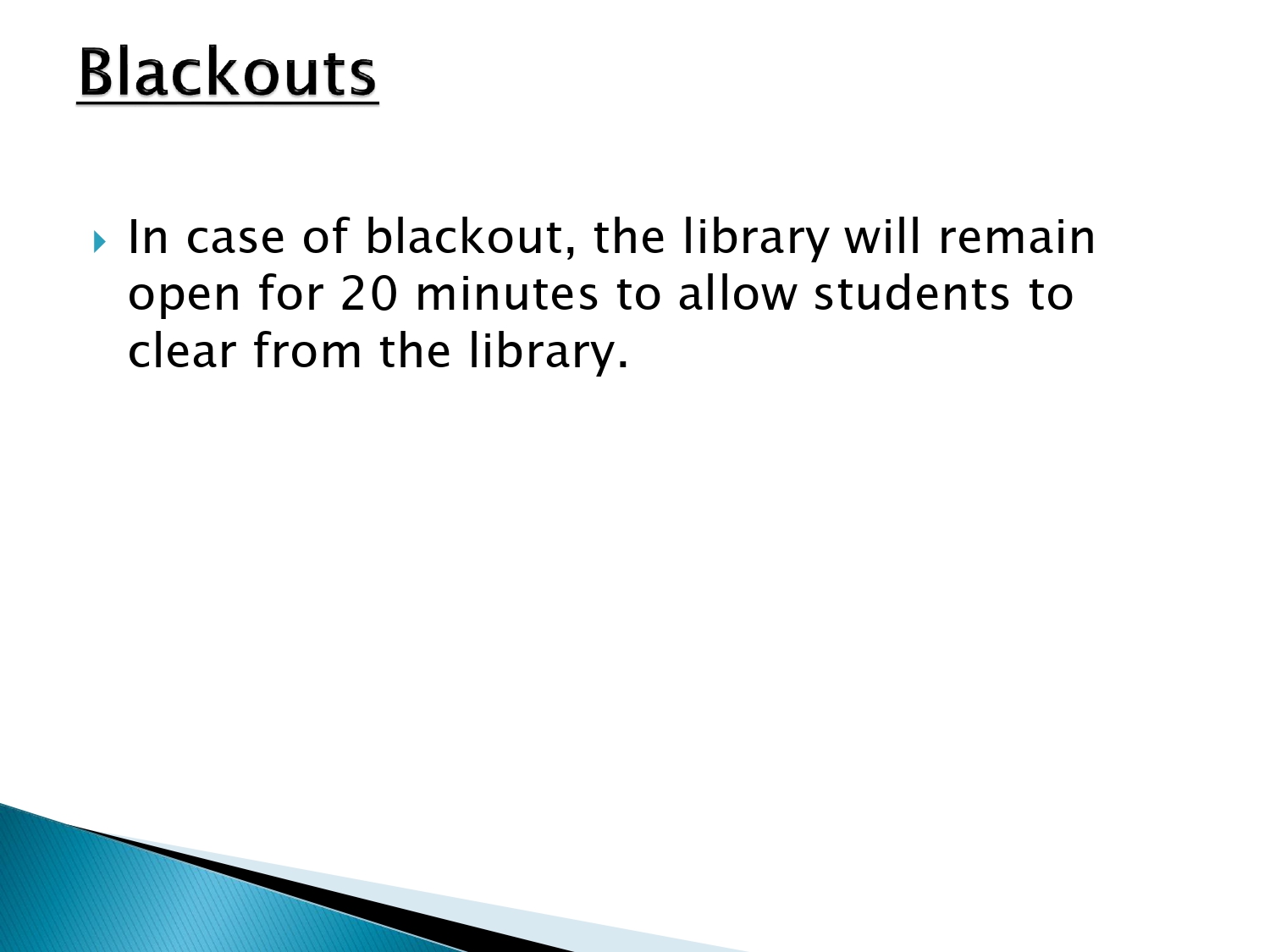 In case of blackout, the library will remain open for 20 minutes to allow students to clear from the library.