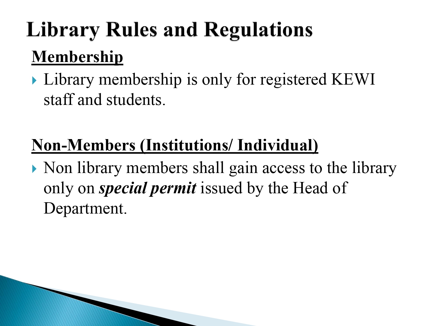 - Non library members shall gain access to the library only on special permit issued by the Head of Department