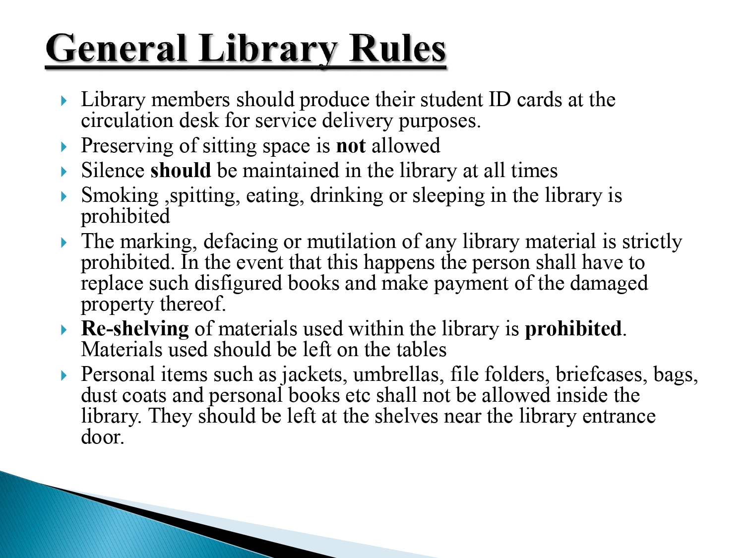 - Personal items such as jackets, umbrellas, file folders, briefcases, bags, dust coats and personal books etc shall not be allowed inside the library. They should be left at the shelves near the library entrance door.
